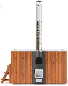 Данная модель оснащена интегрированной печью мощность 35 кВт, которая нагревает воду всего за 1,5-2 часа до комфортной температуры. Печь изготовлена из нержавеющей стали AISI-304. Не требуется подключение к электросети, легко чистить от золы и протапливать. Печь безопасна, оснащена защитным экраном на дымоходе, жаропрочным стеклом, никаких острых углов, все технические коммуникации спрятаны внутри конструкции.